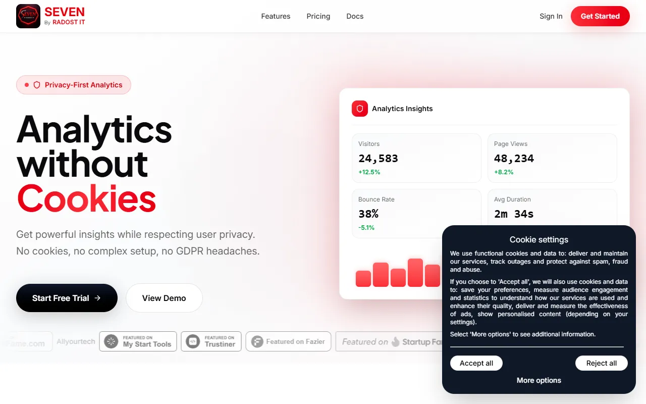 Seven by Radost IT: privacy-first website analytics without cookies, easy setup, accurate insights.