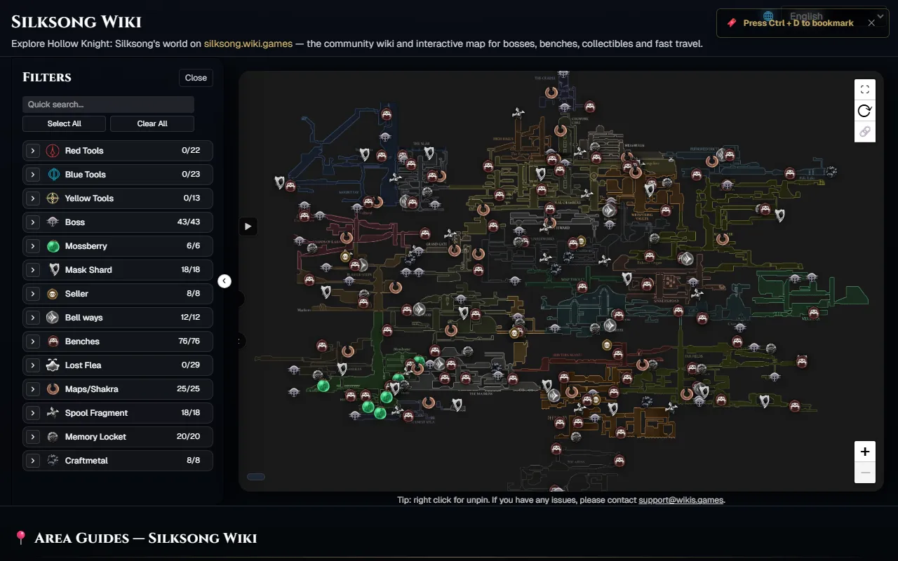 Interactive Silksong map for tracking bosses, secrets, benches, and 100% completion in Pharloom.