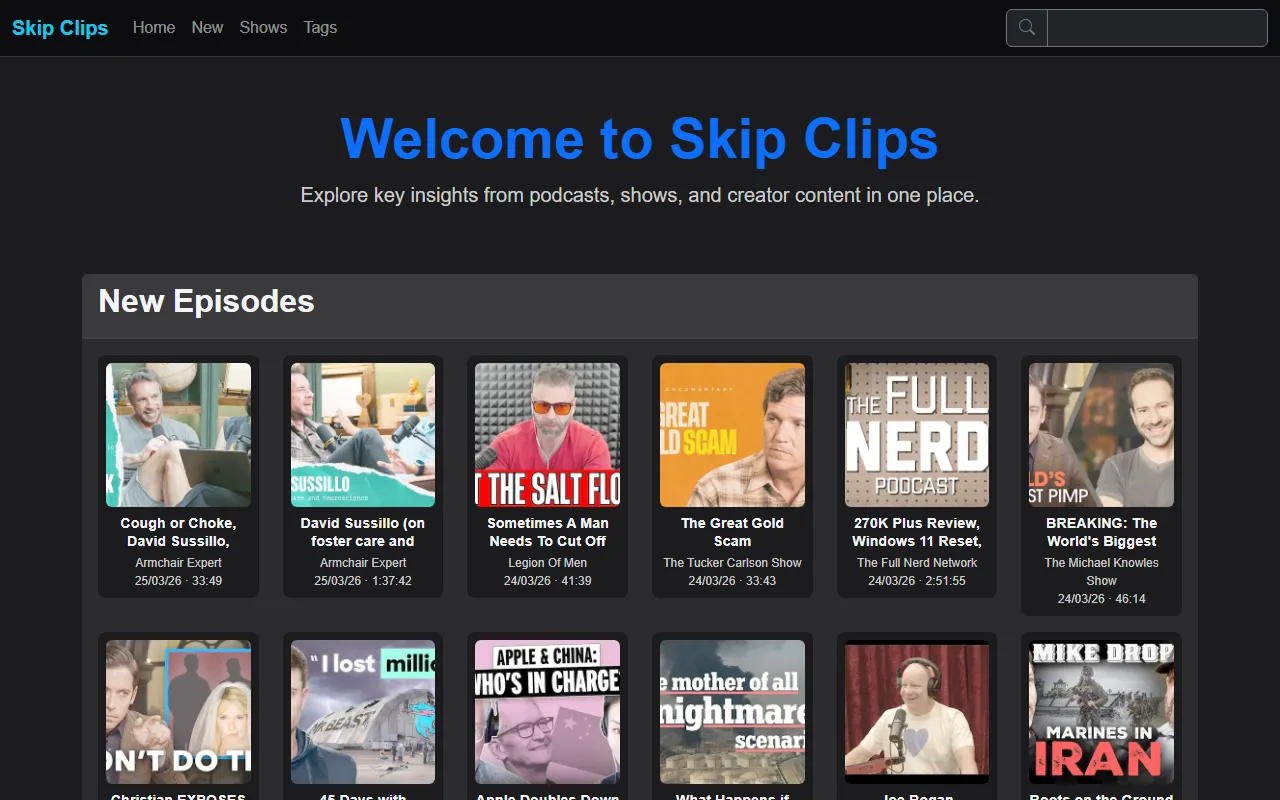 SkipClips AI summarizes and tags long-form episodes for quick, detailed discovery and tracking.