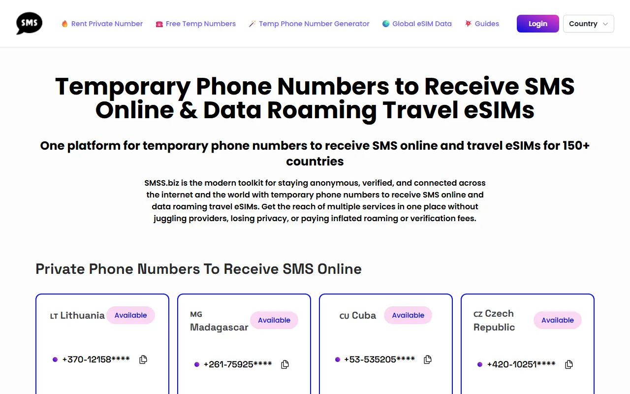 SMSS.biz offers instant SMS verification, private numbers, eSIMs, and VPNs—no apps or signup needed.