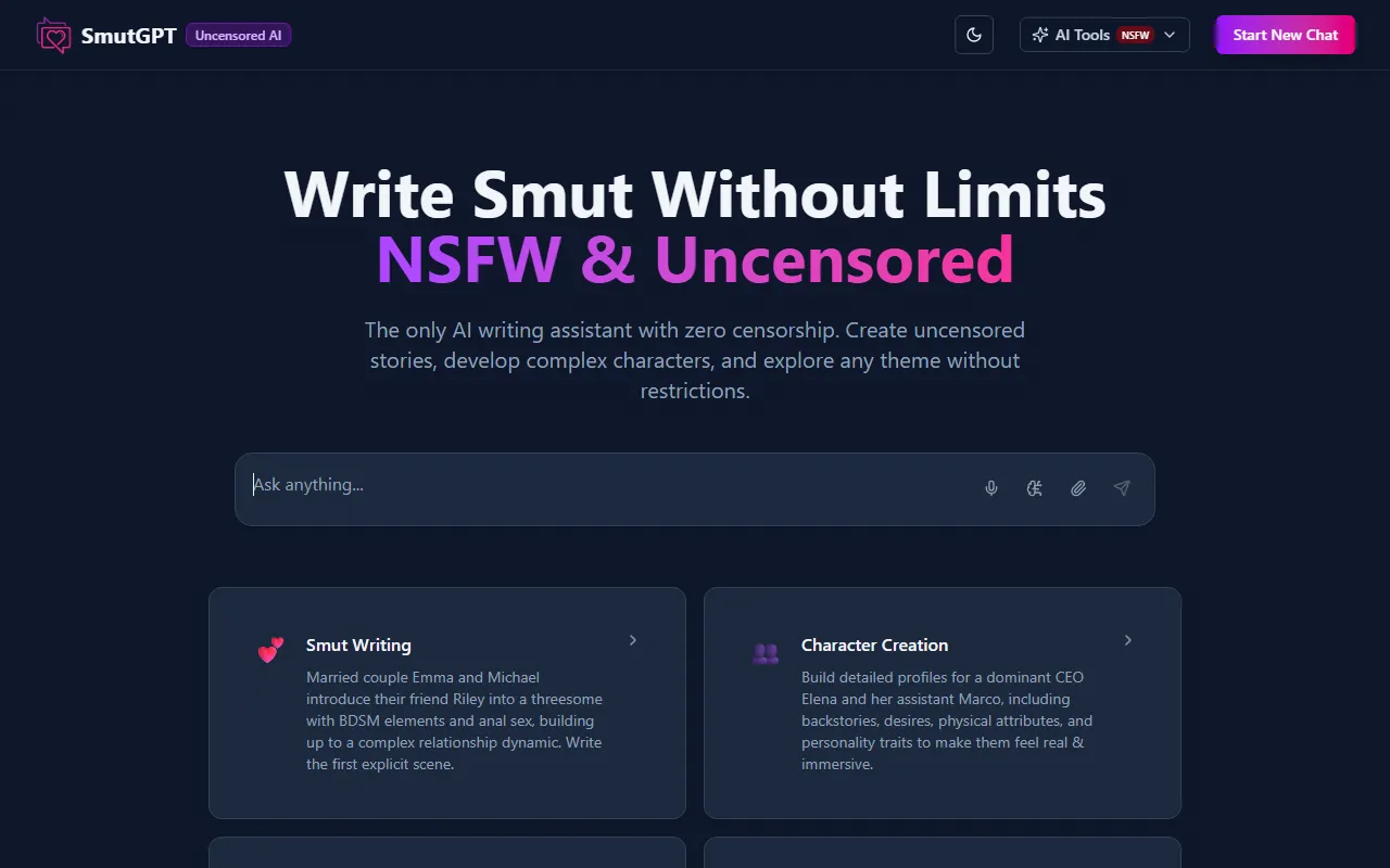 SmutGPT: an uncensored AI tool for creating detailed, explicit adult fiction with creative freedom.