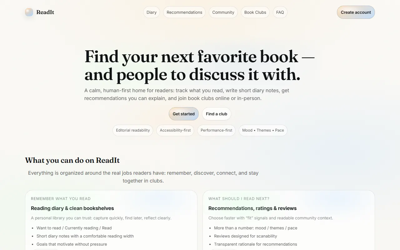 ReadIt Сlub: Effortless book club management with personalized recommendations and community-driven discussions.