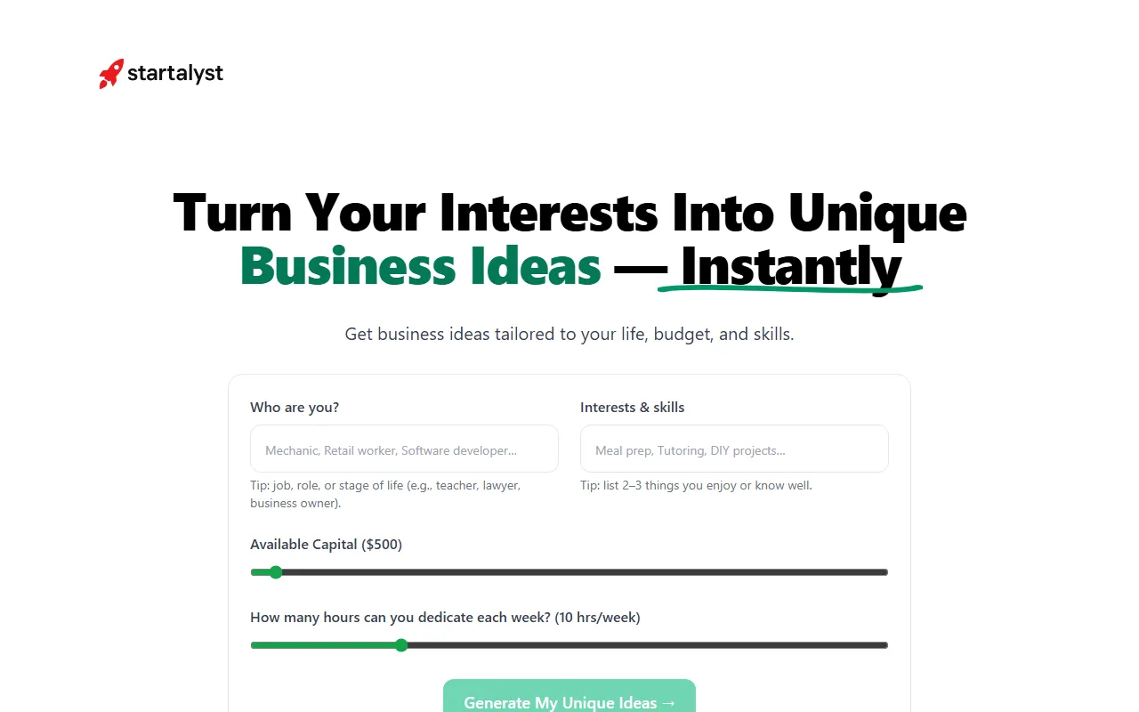 Startalyst generates actionable AI-driven business ideas with strategies and instant website creation.