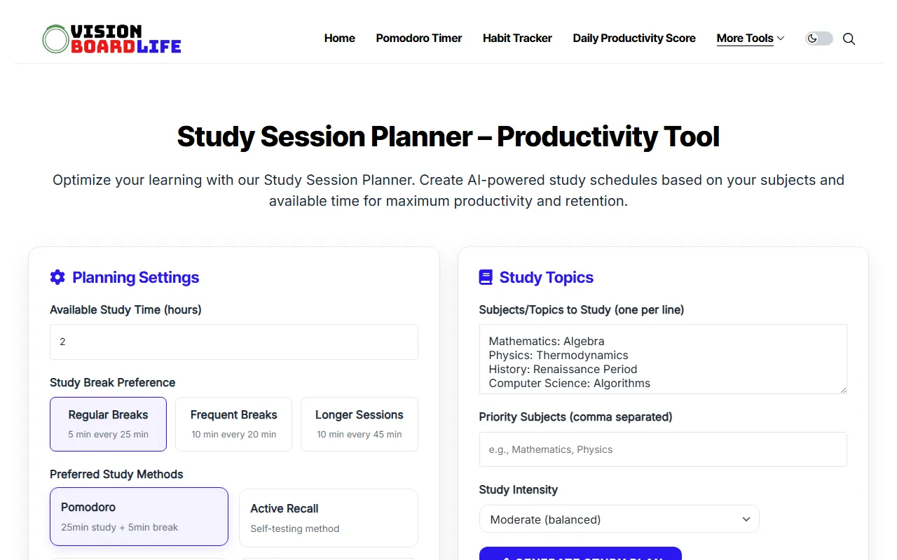 Study Session Planner organizes and improves learning with customizable schedules, progress tracking, and focus timers.