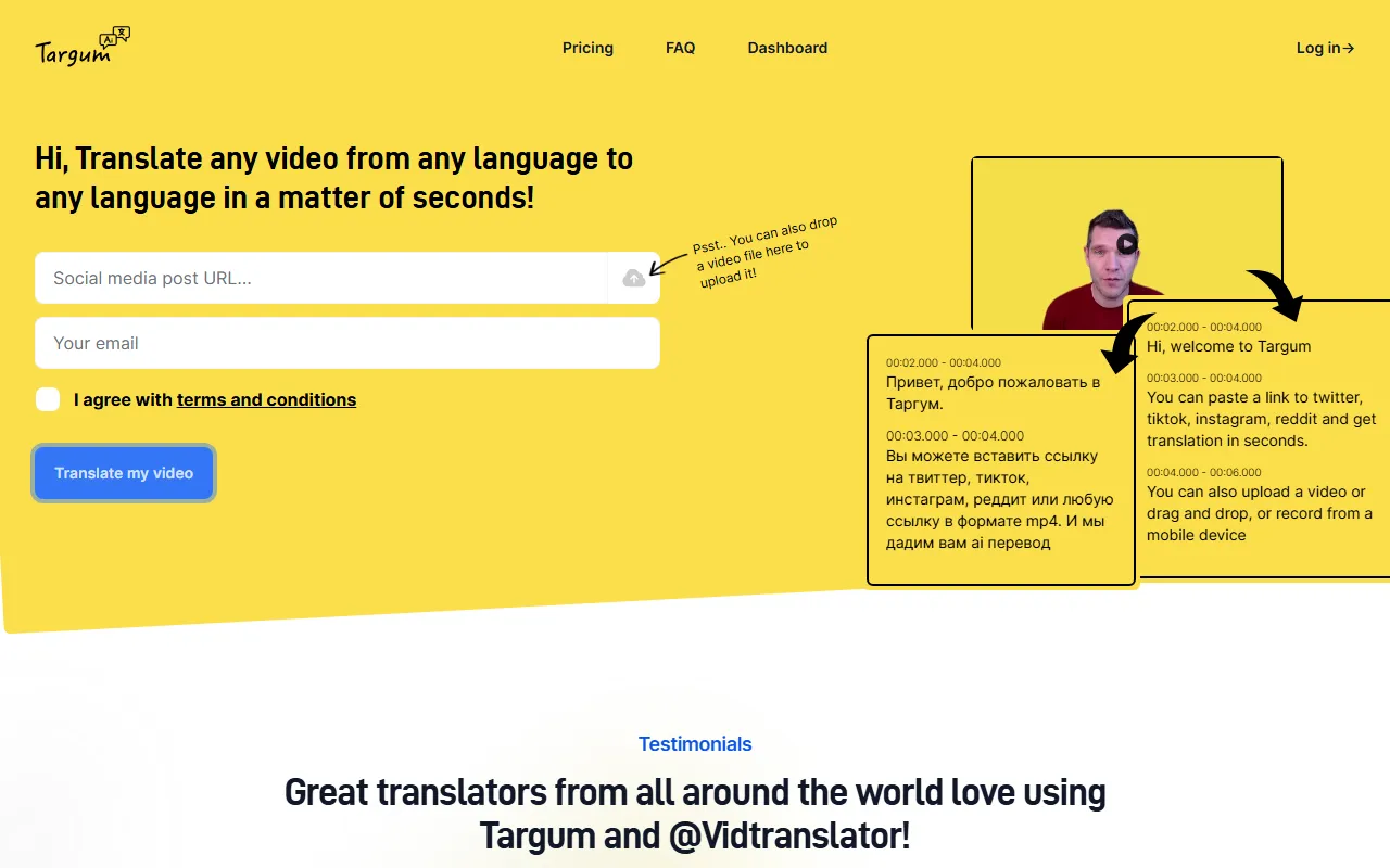Targum Video enters the AI Localization arena as a purpose-built AI solution for translators, localization managers, and global teams. Instantly translate and share social media videos worldwide, breaking language barriers in seconds. In a market crowded with generic tools, Targum Video distinguishes itself through its specialized focus on delivering measurable results in language translation and adaptation and a user experience designed to get you productive from day one.