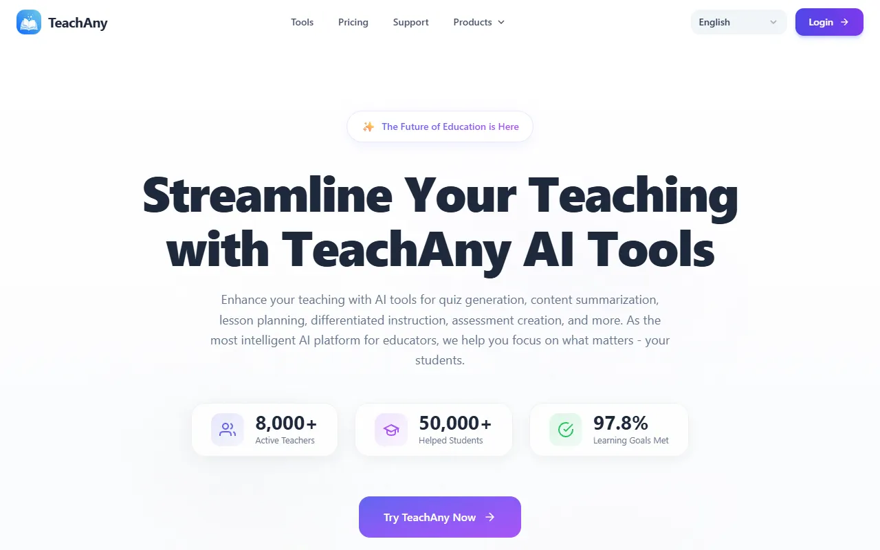 TeachAny: AI-powered toolkit streamlining lesson planning, quizzes, and personalized teaching worldwide.