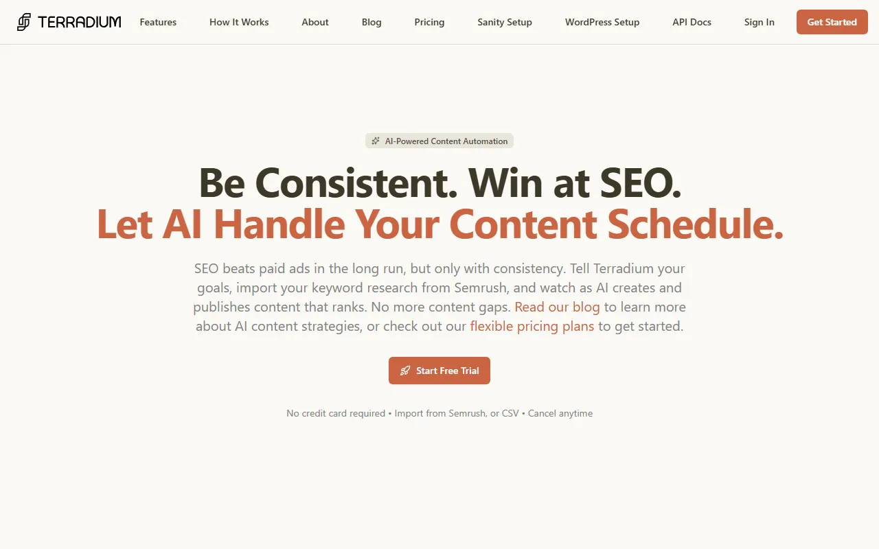 Terradium automates SEO research and content creation, delivering polished blog posts with instant publishing.
