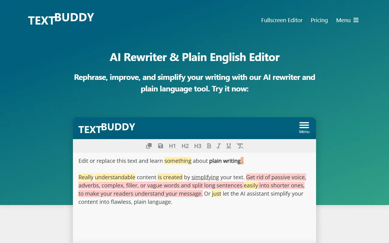 - AI writing: Textbuddy provides robust ai writing functionality, allowing users to optimize with precision and efficiency. This feature is powered by advanced AI models that adapt to your specific use case and improve over time based on your interactions.