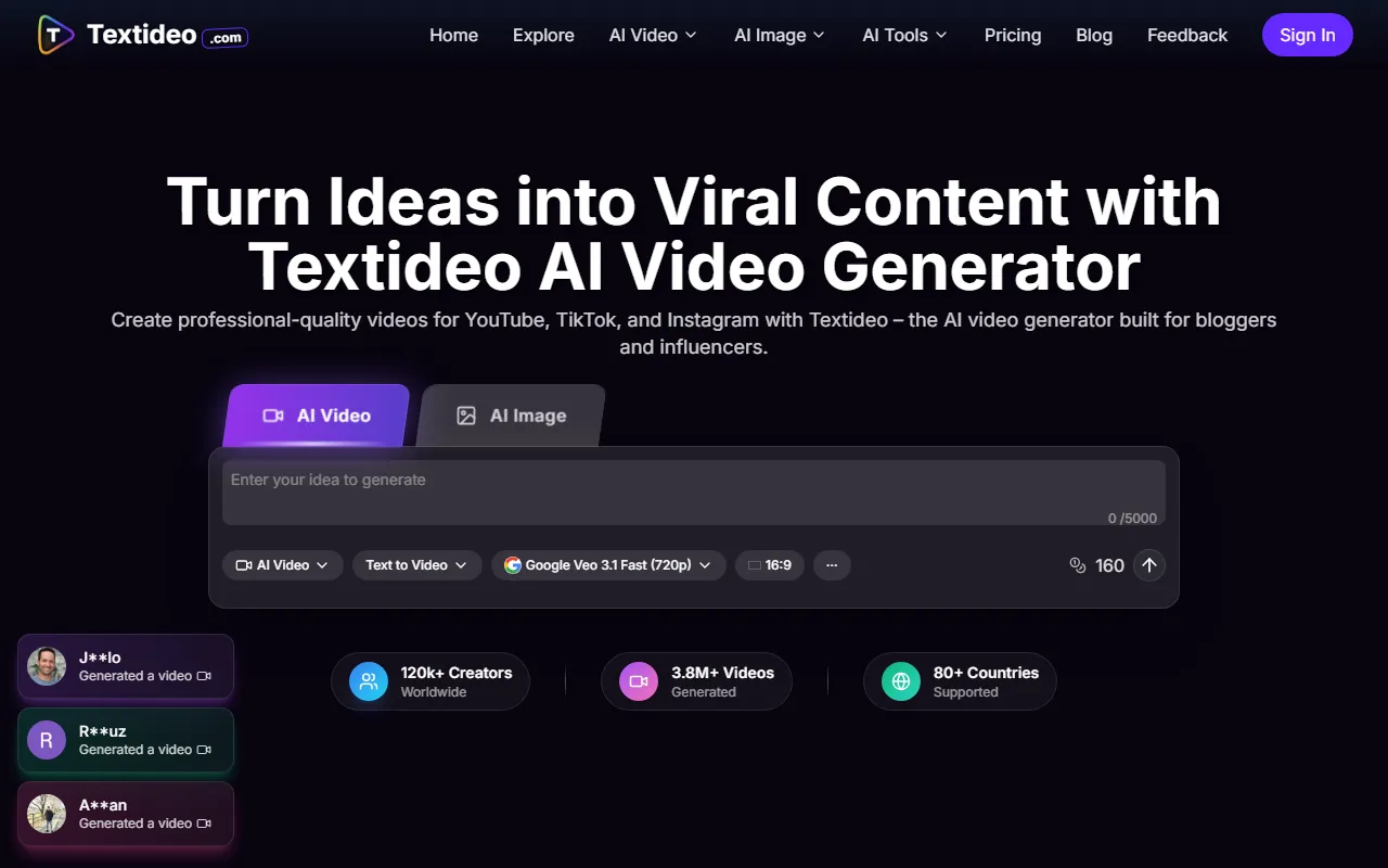 - Video generation: Textideo includes a dedicated video generation engine that processes your inputs intelligently. The system learns from each interaction, delivering increasingly personalized and accurate results the more you use it.
