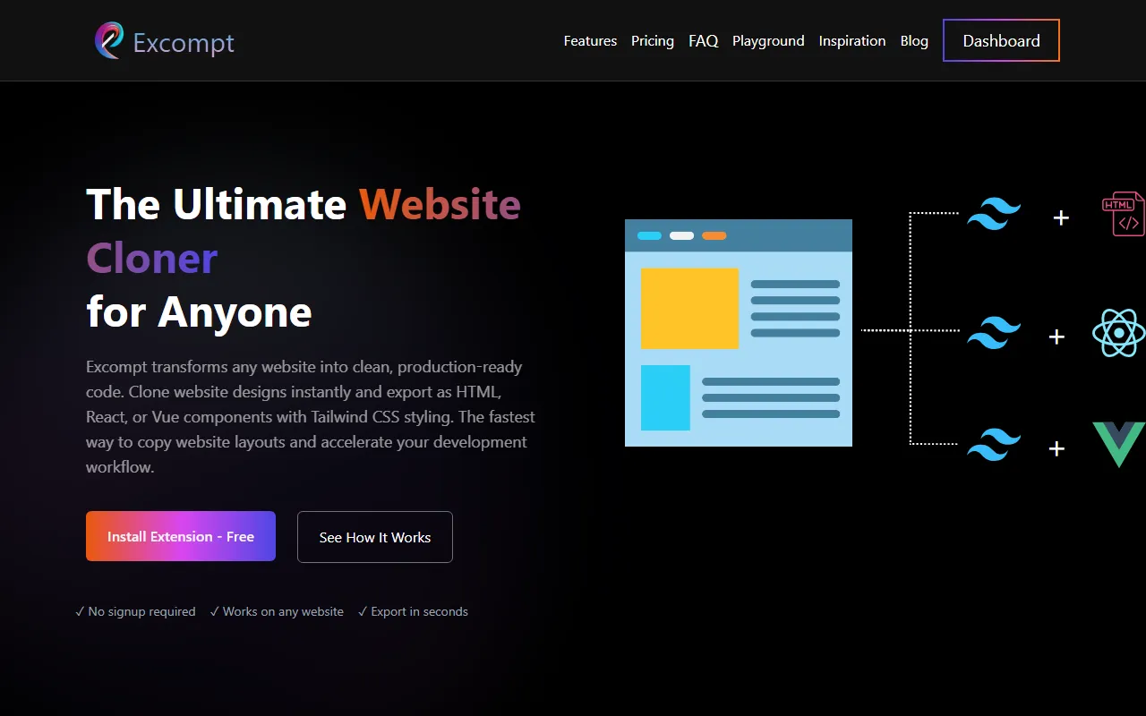 Excompt instantly converts any website into clean, production-ready HTML, React, or Vue code with Tailwind CSS.