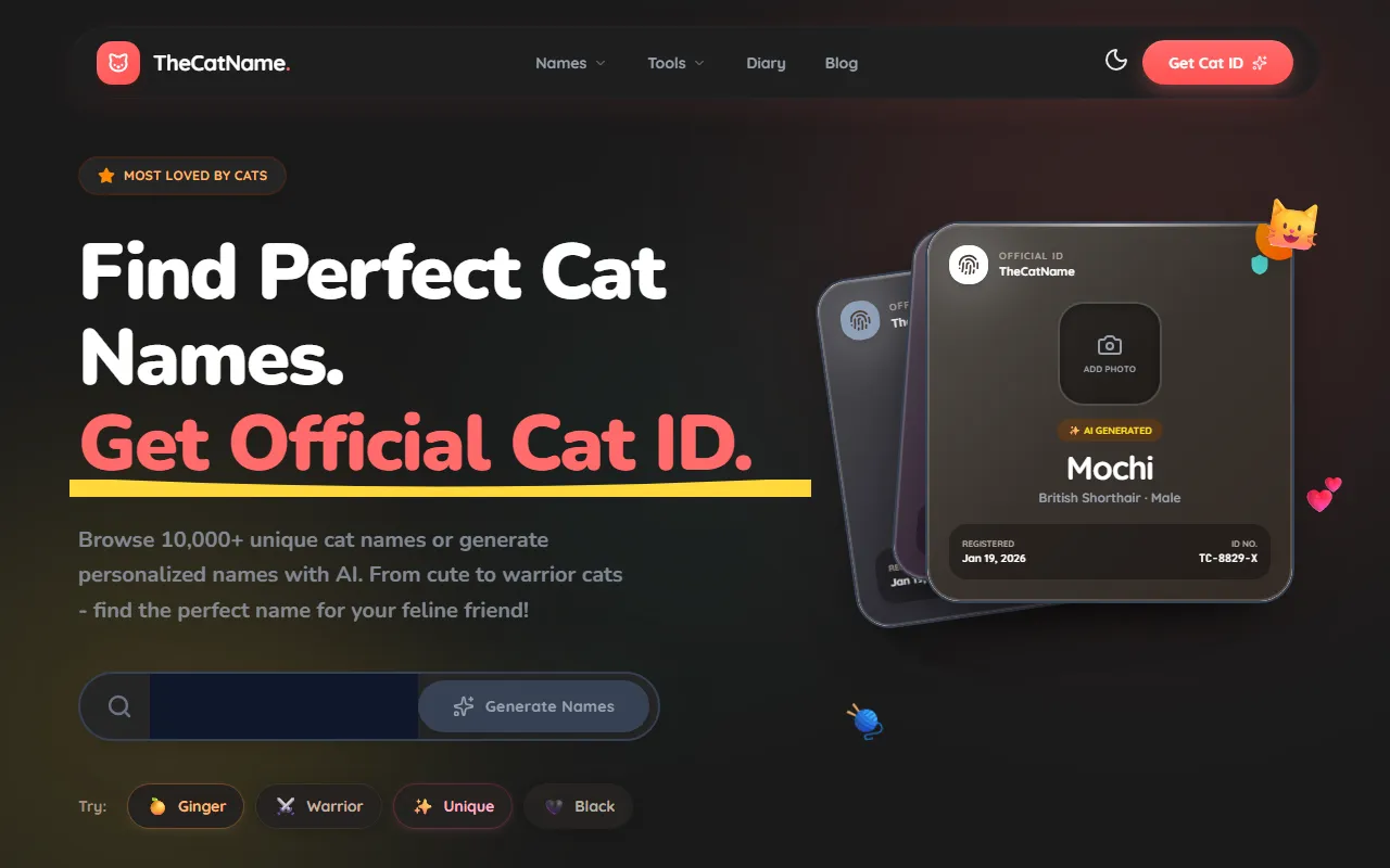 TheCatName enters the AI Customer Support arena as a purpose-built AI solution for support teams, service managers, and CX leaders. Free AI cat name generator offering personalized, themed, and bilingual options with certificates. In a market crowded with generic tools, TheCatName distinguishes itself through its specialized focus on delivering measurable results in customer experience and support and a user experience designed to get you productive from day one.