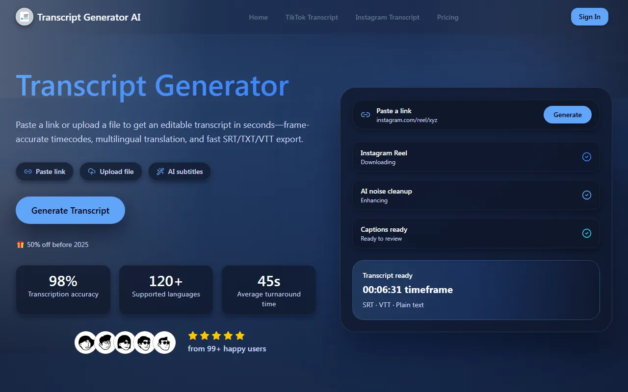 Transcript Generator AI is best suited for podcasters, musicians, and audio engineers who want to process more efficiently without a steep learning curve. The platform is particularly effective for individuals and small teams who need professional-grade audio content but lack the resources to hire specialized staff or invest in enterprise-level solutions.