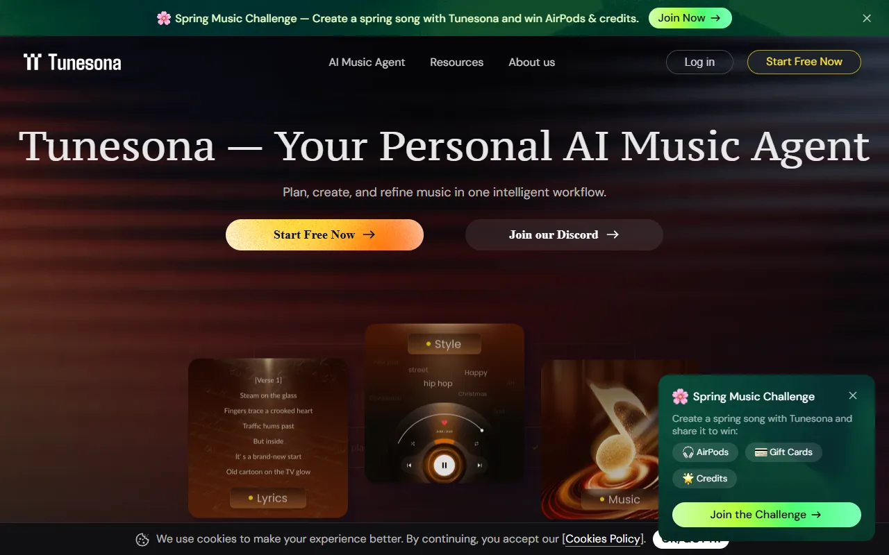 - AI music composition: Tunesona AI Music Agent provides robust ai music composition functionality, allowing users to streamline with precision and efficiency. This feature is powered by advanced AI models that adapt to your specific use case and improve over time based on your interactions.