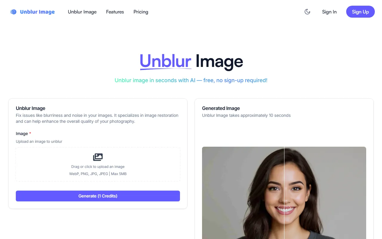 - Image generator: Unblur Image AI provides robust image generator functionality, allowing users to generate with precision and efficiency. This feature is powered by advanced AI models that adapt to your specific use case and improve over time based on your interactions.