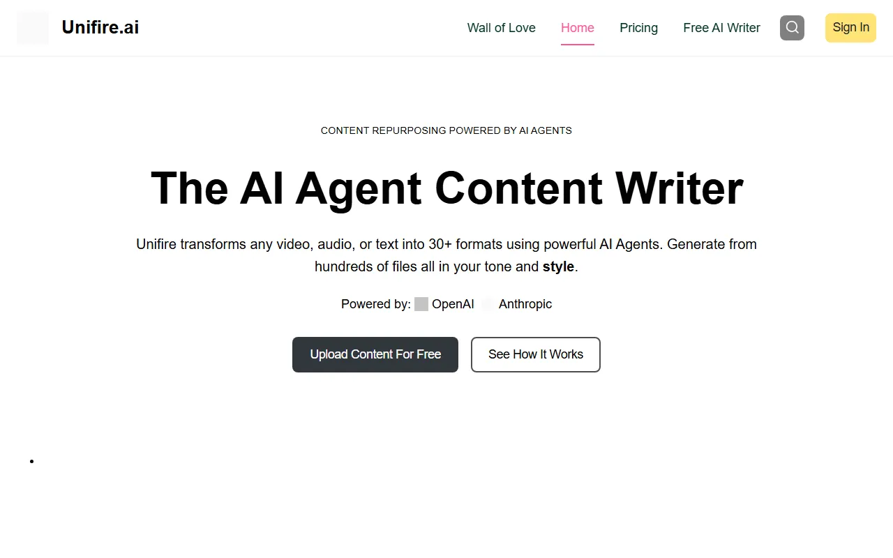 For writers, marketers, and content creators seeking smarter ways to handle content creation and writing, Unifire presents an intriguing proposition. Transform your content into 32+ dynamic assets effortlessly with Unifire's repurposing platform. The platform aims to bridge the gap between complex AI technology and practical, everyday utility, making advanced capabilities accessible without requiring deep technical expertise.