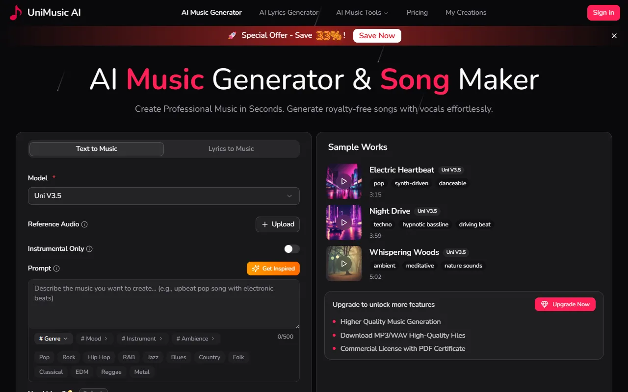 UniMusic AI creates original, royalty-free music fast with vocals, stems, and lyrics—no skills needed.