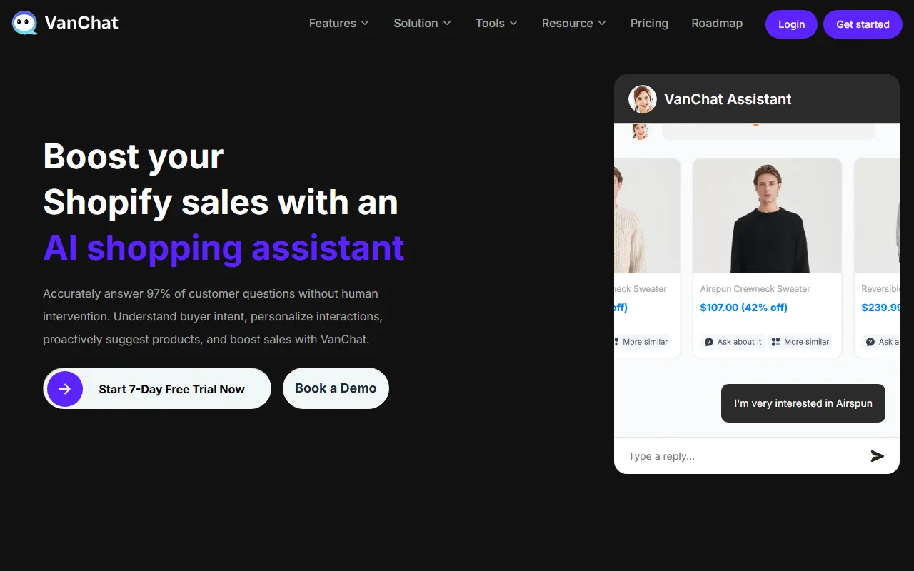 Transform your Shopify store: VanChat drives sales, personalizes service, and achieves 1500% ROI.