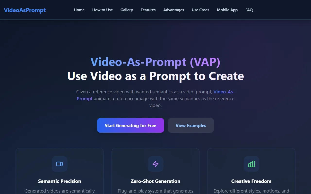 Video-As-Prompt is making waves in the AI Video space with its focused approach to video creation and editing. Video-As-Prompt generates semantically precise videos using combined video, image, and text prompts for creative control. Rather than trying to be everything to everyone, the platform has carved out a niche by concentrating on what video creators, filmmakers, and social media managers actually need to produce more effectively.