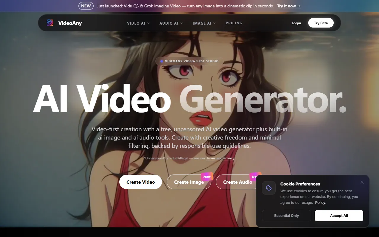 VideoAny: AI-powered studio creating audio, images, and videos seamlessly for fast, professional content.