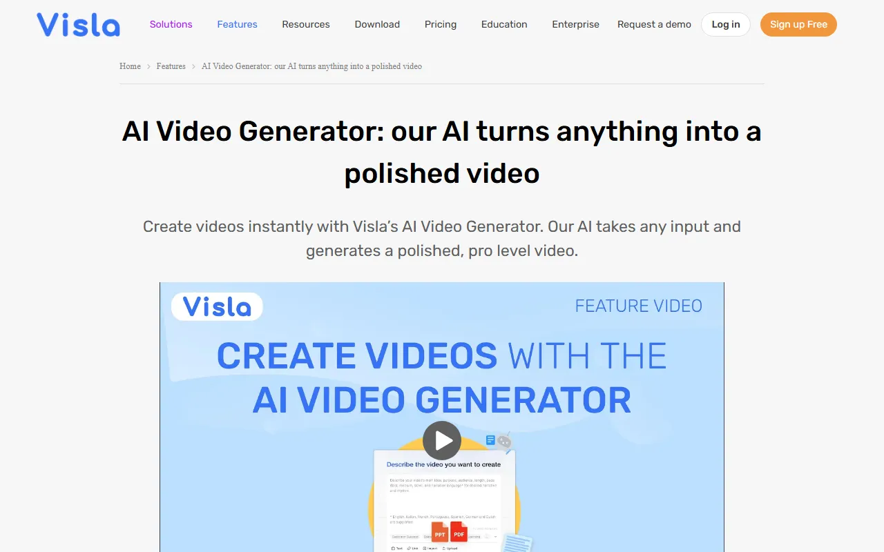 - AI video creation: Visla provides robust ai video creation functionality, allowing users to generate with precision and efficiency. This feature is powered by advanced AI models that adapt to your specific use case and improve over time based on your interactions.