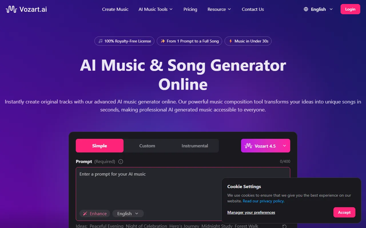 Vozart.ai creates royalty-free, customizable music quickly for creators with full commercial rights.
