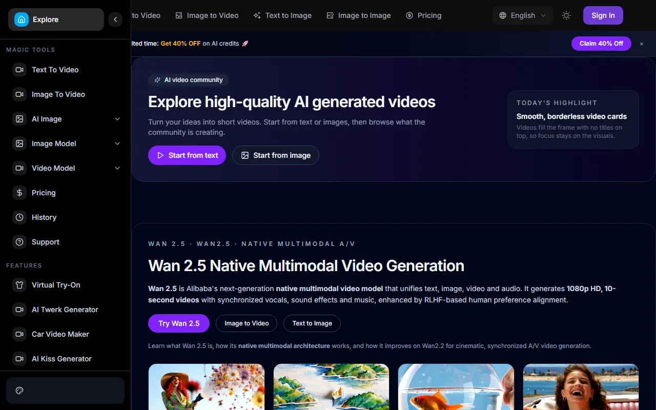 - Text-to-video: wanai.dev includes a dedicated text-to-video engine that processes your inputs intelligently. The system learns from each interaction, delivering increasingly personalized and accurate results the more you use it.
