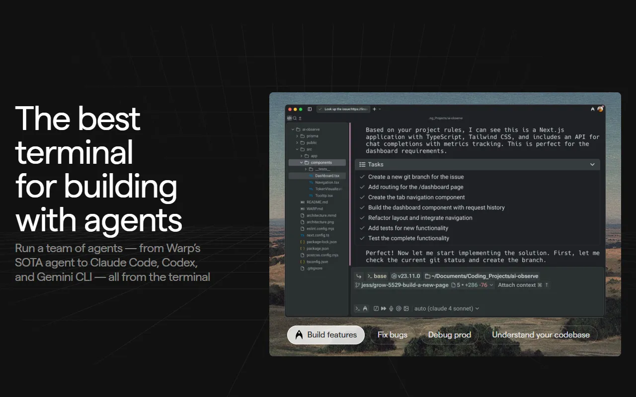 - Terminal: Warp Terminal provides robust terminal functionality, allowing users to assist with precision and efficiency. This feature is powered by advanced AI models that adapt to your specific use case and improve over time based on your interactions.