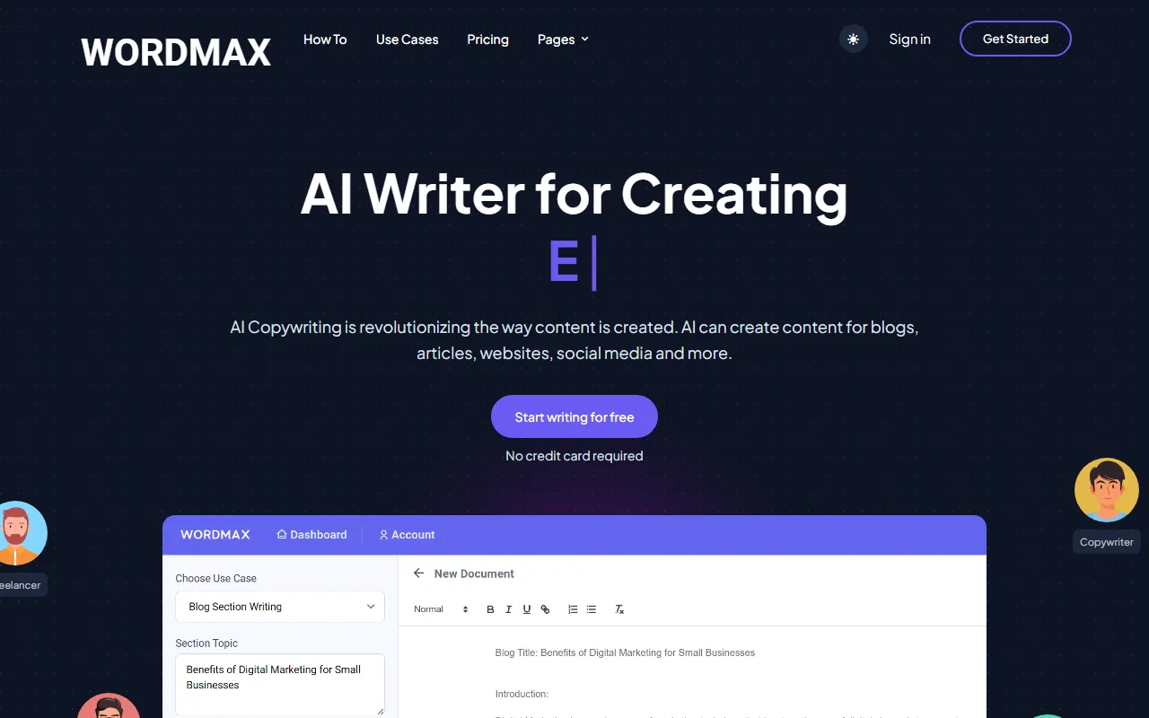 - AI writing: Wordmax provides robust ai writing functionality, allowing users to create with precision and efficiency. This feature is powered by advanced AI models that adapt to your specific use case and improve over time based on your interactions.